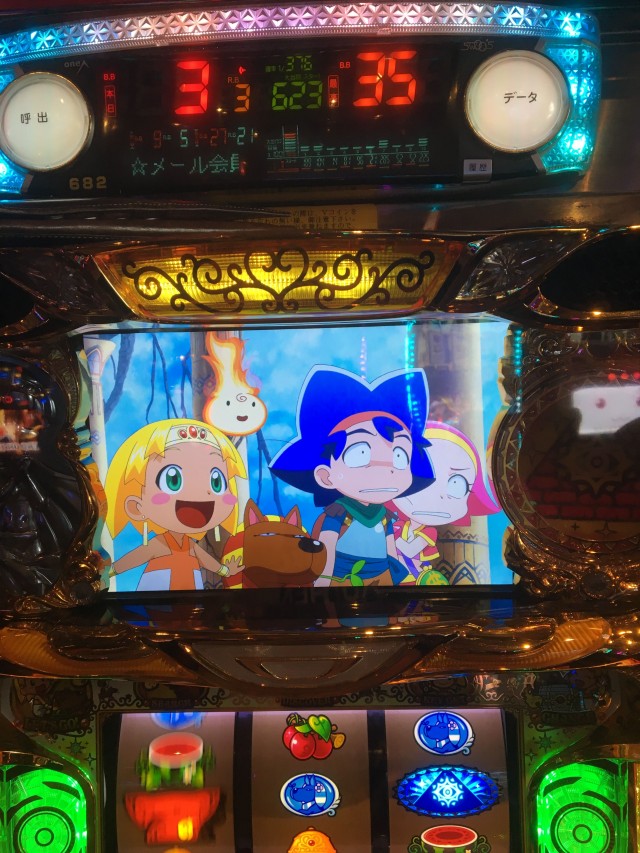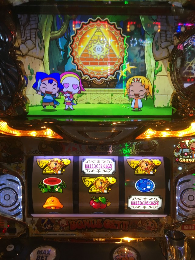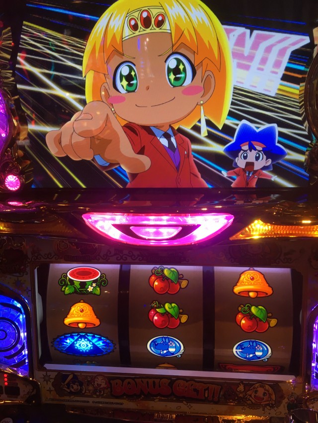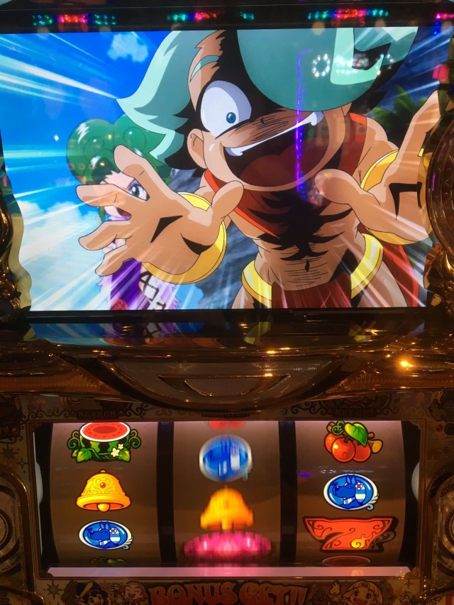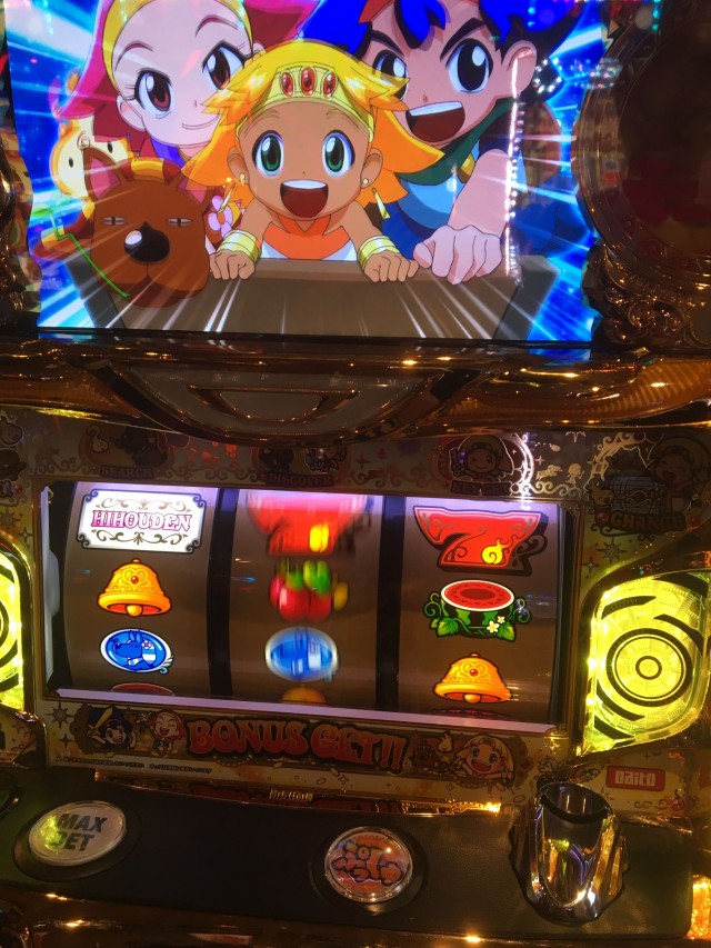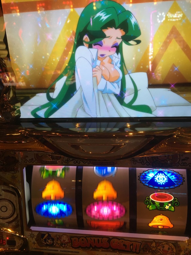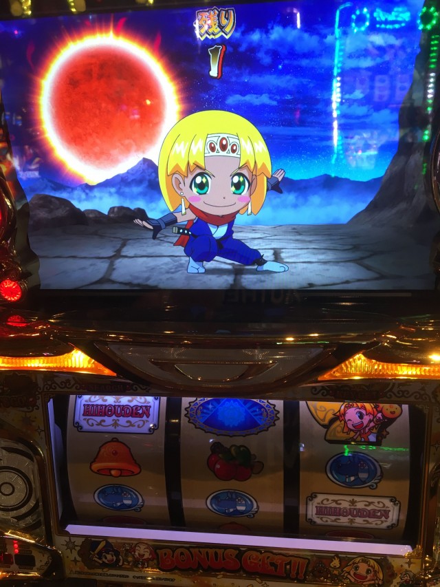 逆押しでピンクピラミッドを中下段に狙い下段に赤7停止、これは基本チャンス目なのでチャンスですな!