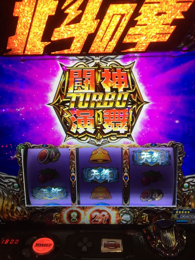 お次のARTは通常時からいきなり闘神演舞ターボへ、このパターンは高確or前兆中に天舞の刻を引いた際に発動するボーナスですね。