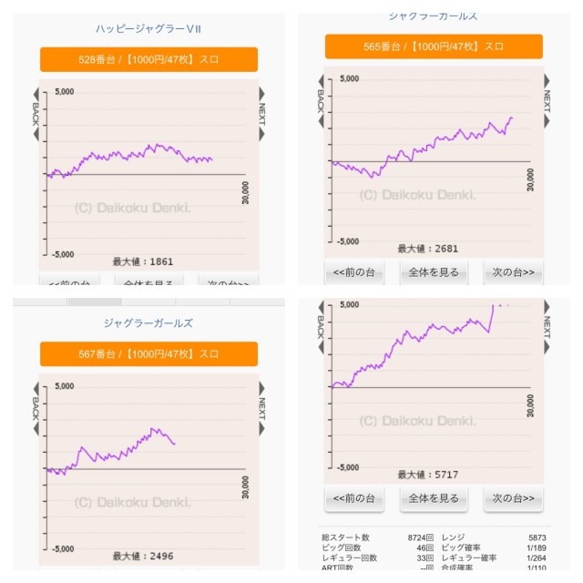 今回はいつも後半伸びてくるジャグラーシリーズにも朝からガシガシ回している人がいましたしちゃんと反応してましたね\(^o^)/途中ジャグラーガールは悩みましたがスルーしましたw