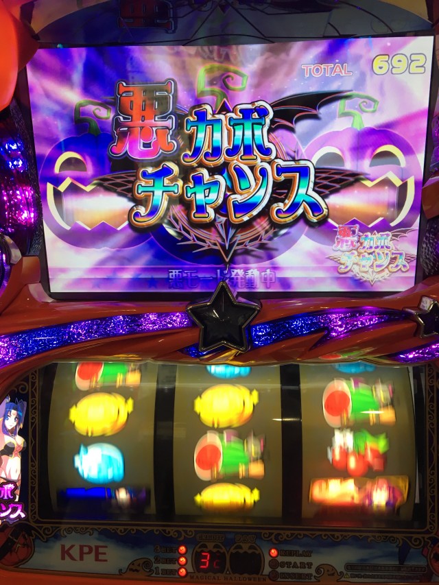 ※左リールに「リプレイ・カボチャ・リプレイ」を止めた際に当たっているかの示唆をおこなっている