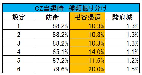 駿府城自体の選択率にはあまり設定差はありませんね、「卍谷へ帰還せよ」のCZを高設定ほど選びやすい傾向にあります。