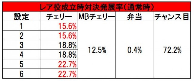 更に注目が特定役からの対決発展率ですかね、チャンス目は一律ですがチェリーに設定差がありなのでカウントしてもいいかもしれません。