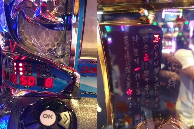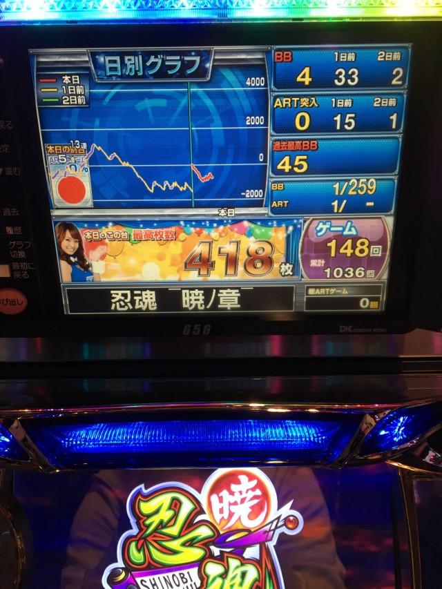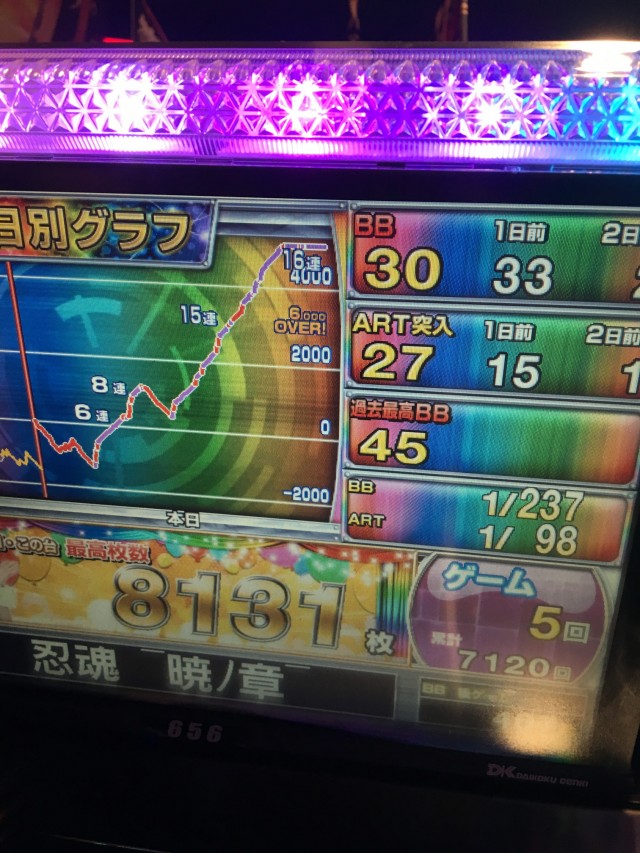 僕が打った忍ですが実は前日終日打ち切られてマイナスだった台でして、6の据え置き狙いで本来良番を引いたら狙おうと思っていた位置でした。