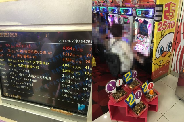 11時開店で16時までの出玉ランキングはこんな感じ、オマケで低貸で出ていたまどか2をパシャリ