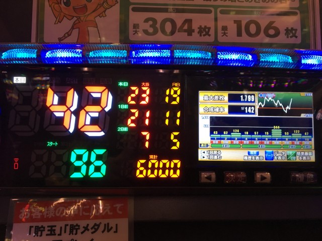 予想設定は2、どうあがいても小役が弱すぎるのと特定ボーナスが一切引けていないのが気になりましたね。