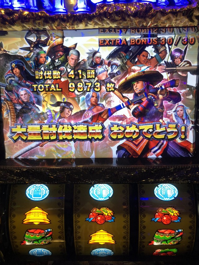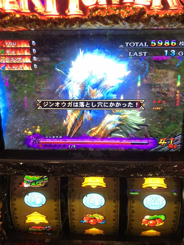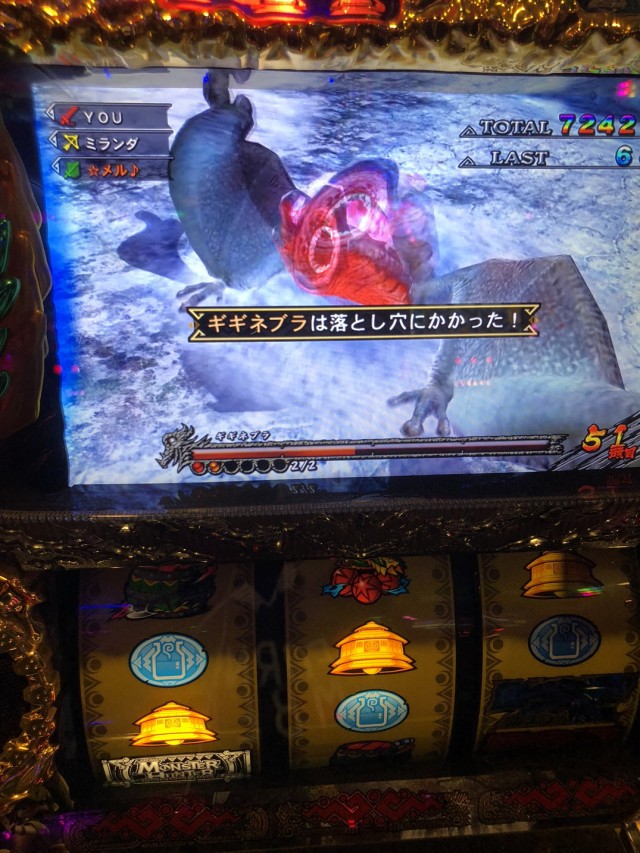 ・・・とか言ってたら隣が青7でジンオウガ⇒赤7でジンオウガと設定56確定パターンを出しているじゃありませんか\(^o^)/すげーw