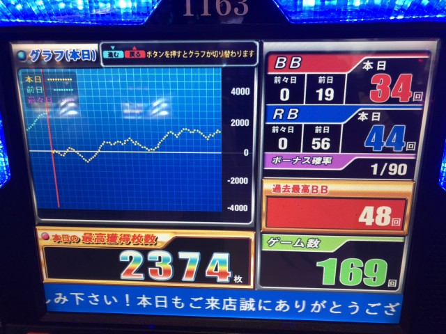 店内ですがギアスとハナビが今回の当たり機種でしたね。ハナビは20時すぎに全台BB中ハズレが出ており(データサイトより確認)