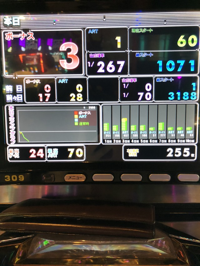 ポイントの貯まり方や状態移行、更には周りの台で既にART直撃やスイカRB、ART後RA引き戻しなどが見えているのでヤメてみることに