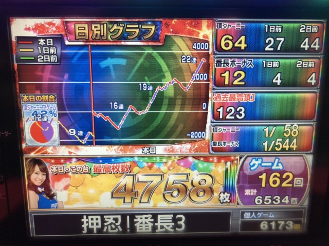 店内は横の番長からも6確定が出ており操パネル3台は全6なのかなと。