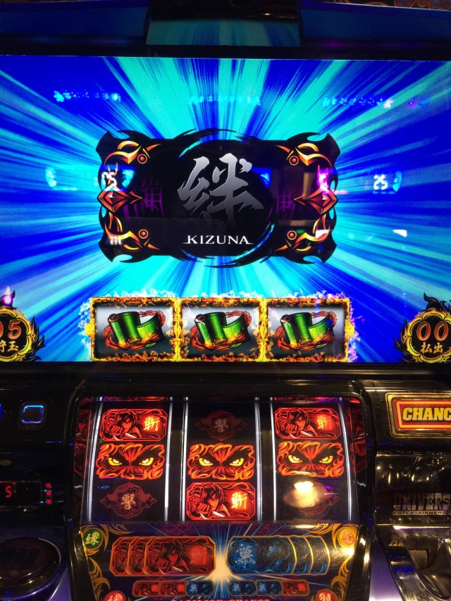 ここに来るまでに実はだいぶヘコんでいたので歓喜のフリーズでした。しかもバジリスクタイム突入画面が天膳。80%継続確定です。さらに絆高確は2つ、つまりフリーズの中でも最高の振り分けを引き当てたわけです。
