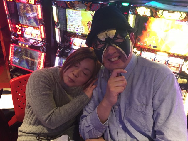 このナイスガイはスロカイザーさん。真夜中だというのに日中と変わらないくらいハイテンションで、こっちまで元気になってきます。ちなみにこの日の深夜実戦は、「パチスロ戦国乙女2~深淵に輝く気高き将星~」。設定看破要素が豊富で、推測しながら打つのが楽しい台なので、萌え台が苦手な私もそんなに違和感なく打てます。音楽もカッコイイし!
