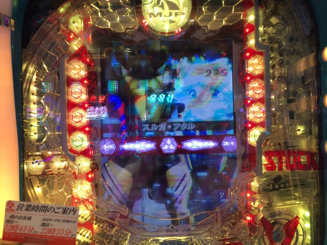 何もわからないまま手探りで打ち始めました。そしたら本当に何も分かりません…。しばらく打っていると、イントロ予告みたいな演出からリーチがかかり役物が合体。よくわかっていない私ですらアツいことがわかりました。しかし、普通にハズレましたわ。