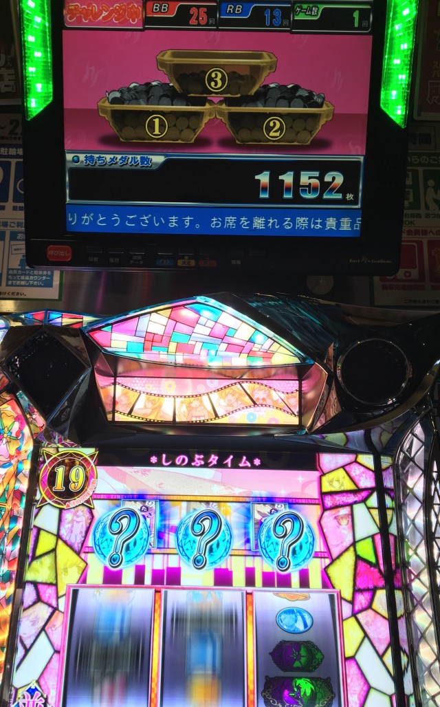 これわかる人にはわかる確定画面。RT(しのぶ選択時)終了時にボーナスに当選していると終了後のレバーオンで「夢ノ時間を終ワらせるナ」が発生することがあり、その演出の最後に出るのがこの画面。この時はRT最終ゲームでチェリーを引きボーナス当選。いやー、上手い。