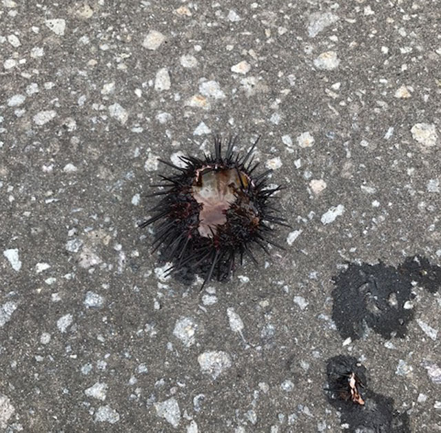 いやーもうビックリですよ。周りをよく見たら中身が空っぽのウニの殻がチラホラ落ちてる。どうやってここまでウニを運んできたのかは謎だけど、とりあえずこの地のカラスは新鮮なウニをいただいているようです。あー本当羨ましい!