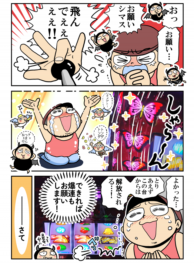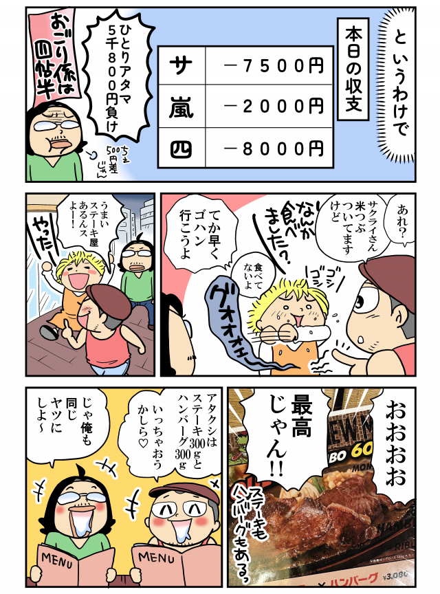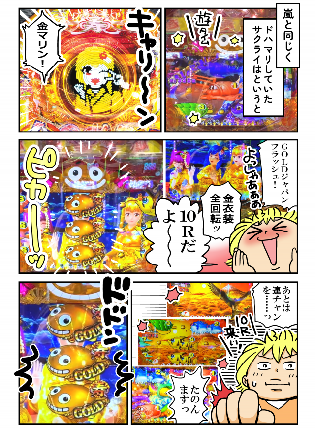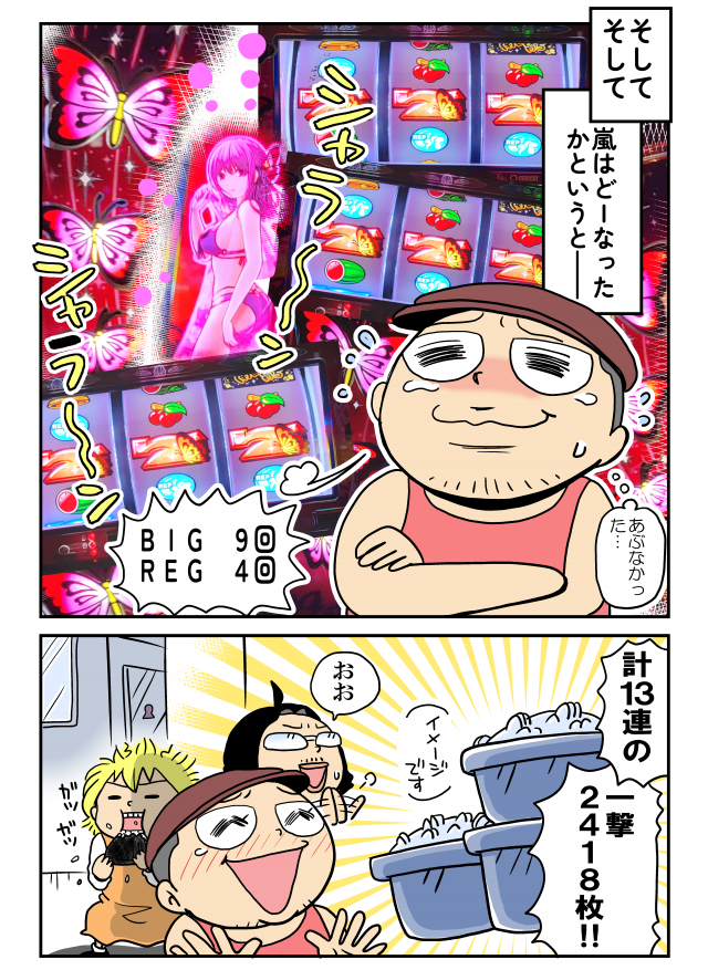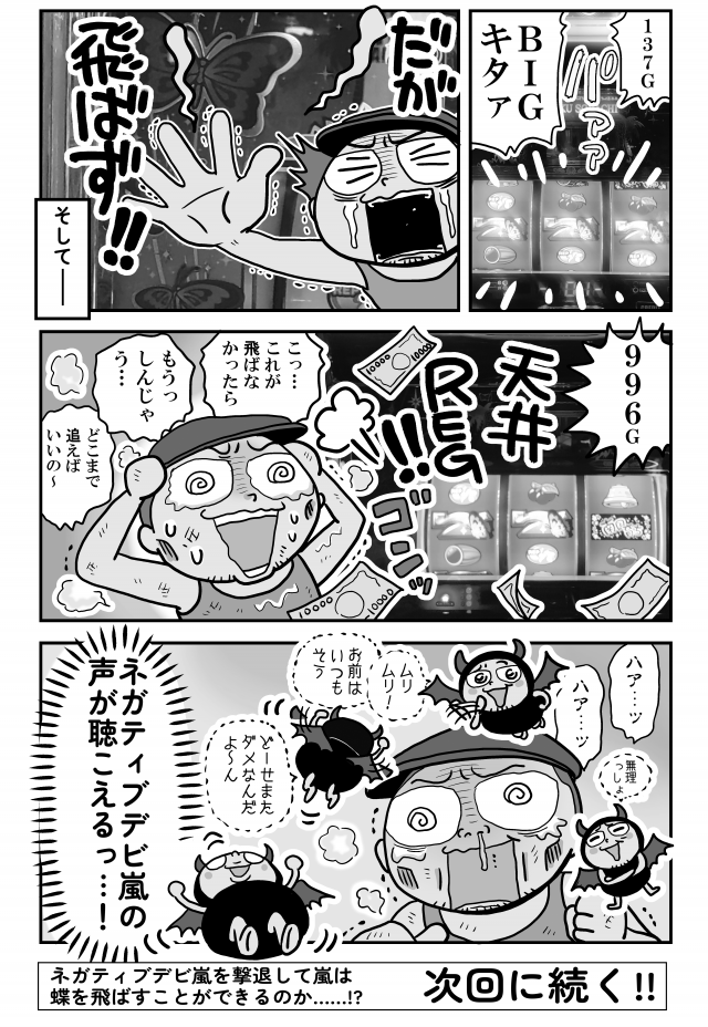 サクライが空腹絶倒直前のなか始まった前回のジャブ実戦。勝ってデカい肉を食らうべく、珍しくひとりだけ絶好調の四帖半と相変わらずの蝶に弄ばれる嵐、そして遊タイム直行のサクライ。前回、前々回に続き今回も嵐は10万OVER負けになってしまうのか…!?