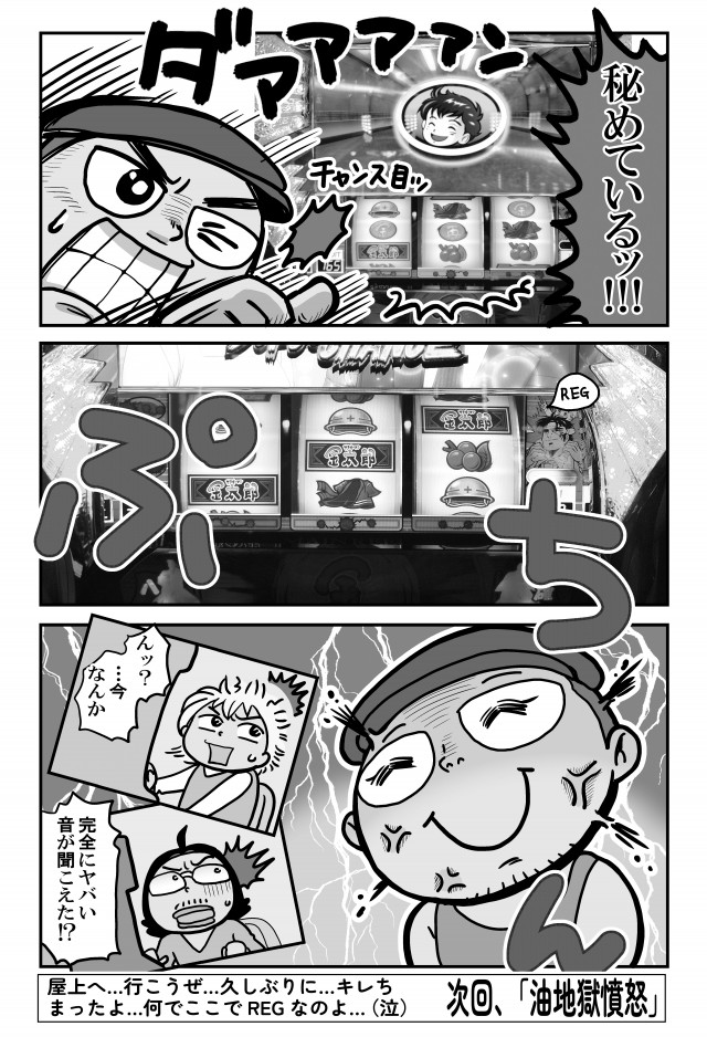 4号機時代の思い出とはうらはらにサラ金で全敗中の嵐。今回の実戦でも好スタートと思いきや気付けばわずか3時間で投資は5万に…。前半戦でキレた嵐は、屋上もとい後半戦で執念の初勝利をつかめるのか…!?
