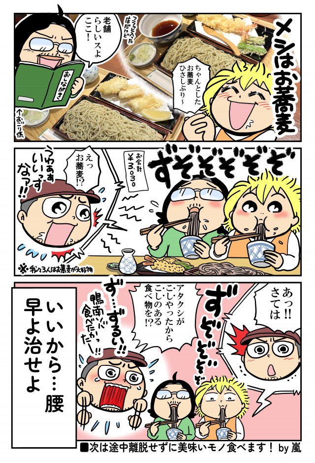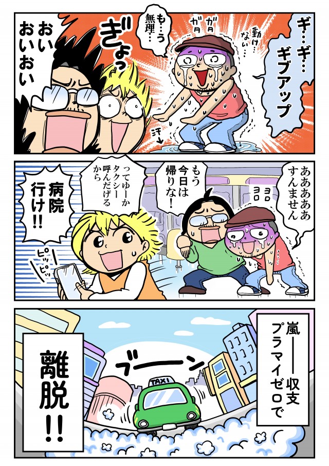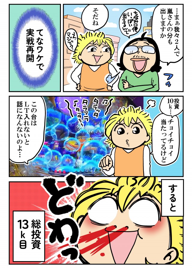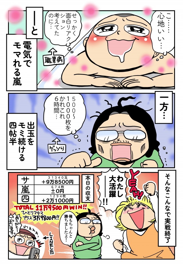 急遽腰に爆弾を抱えるという特大ハンディキャップを背負った嵐。そんな不運と反対に四帖半は朝から絶好調、サクライはいつも通り。勝ち負けどころじゃない嵐は最後まで無事実戦をやり通せるのか…!?