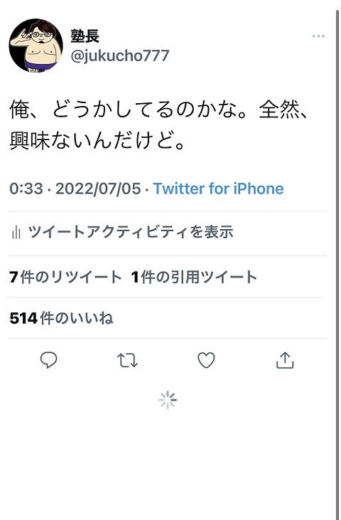 基本的に他人に興味がないのでそうつぶやきました。というか、そもそも赤の他人がああだこうだ言う筋合いのものではないと私は考えていますし、それによってなにか迷惑を被ったわけでも、不利益を被ったわけでもありません。なので、私にとってはどうでもいいこと。無論、だからといって、それについてコメントしている人たちを批判するつもりは毛頭ありません。何故ならそういう乗っかり系の人たちにも私はまったく興味がないからです。ただ、ひとつもためになることを言わぬコメンテイターがたくさん出演している安いワイドショーを観させられているようだったので、しばらくの間、ツイッターのタイムラインを見ることはやめていましたが。
