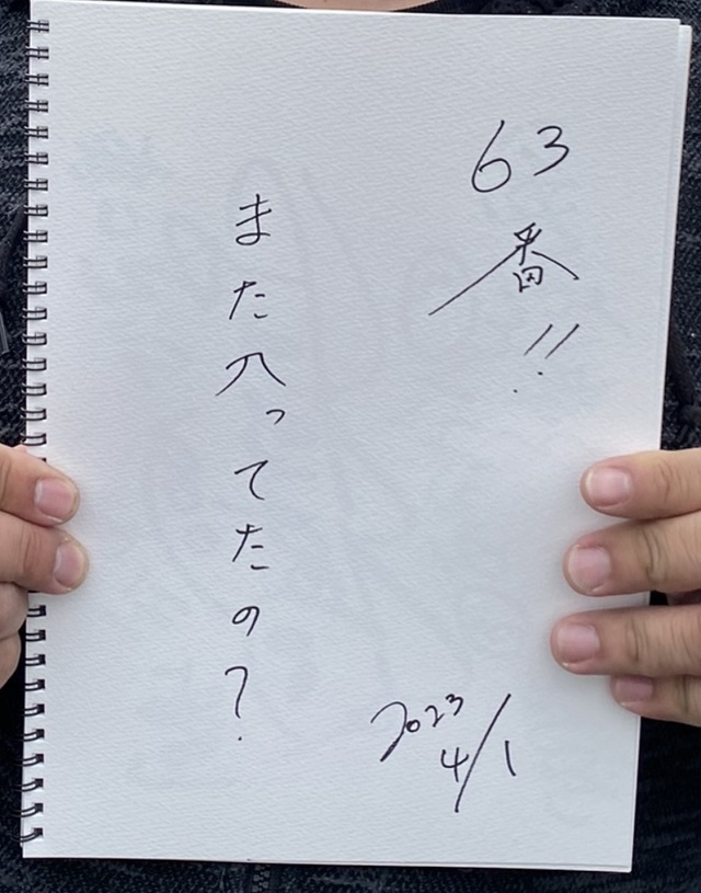 正直、なんのことやらサッパリです。主語が抜けているためどこに入っていたのか分かりませんし、63番が入場抽選の番号なのか否かも分かりませんし、そもそもこれをサインと言っていいのかどうか、そのあたりもよく分かりません。これは一体どういうことなのか……その答えは騎士団の彼の風貌にありました。