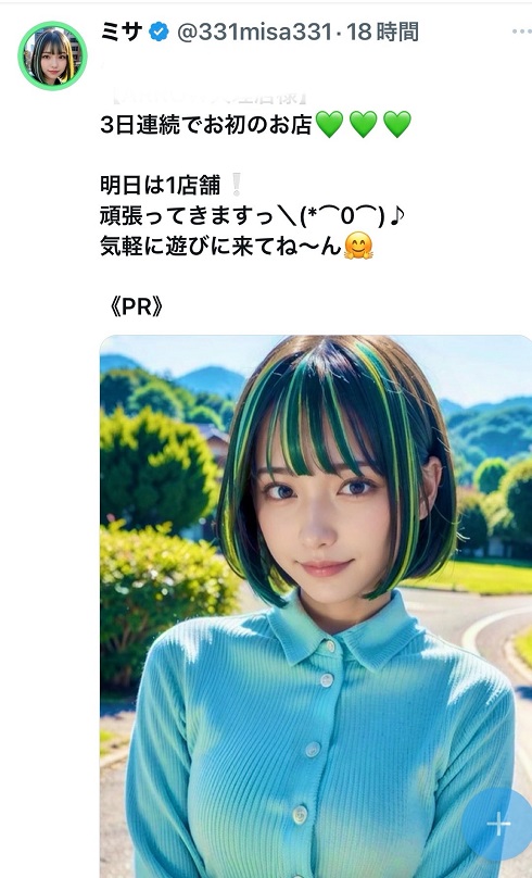 先日、芸能人と見紛うほどのルックスを有した美女が来店告知をしておりました。ナツ美女史に匹敵、いや、それを若干上回る美しさだったので上野、浅草エリアなら見に行こう、打ちもしないし、肩トントンもしないし、なんなら声もションベンもかけないけどとりあえずどんなものか見に行こうと思ったのですが、アカウントをチェックしたらAIであることが判明。無駄な時間、労力、金を使わずに済んで本当に良かったと胸を撫で下ろした次第です。