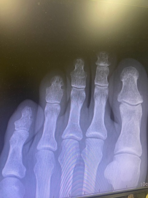 診断の結果、左足人差し指骨折と判明。どうりで痛いわけだといった感じですが、先ほどのナイチンゲールと違って医師はとても丁寧。レントゲン写真を指さしながら「ここに黒い線が見えるでしょ」とか、「指は全部で五本あるでしょ」とか、まるでチンパンジーになにか教えている感じとでも申しましょうか。とにかく医学用語を使わず、チンパンジーにもわかりやすいよう懇切丁寧に教えてくれたのでとても助かりました。
