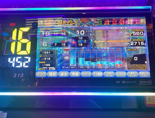 そして迎えた次戦、神奈川の来店で打ったシェイクはとにかくよく当たる。ボーナス合算が最高設定のそれを上回ることも度々あったとくれば、頭上のデータ表示器を見て悦に入っていたとしてもおかしくはないのですが、下にある写真を見ればおかりでしょう。実際にはデータ表示器でなく、時計ばかり見ていました。