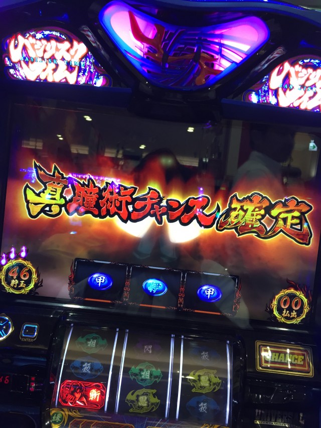 BT非当選が何度か続き、次のBCがスカだったら新たな移動先を探そう。ハナビかトイレに移動しよう。そう思った矢先、BC中に巻物を二度引く幸運に恵まれましてこの日初めてのBT当選。突入画面の左側はスケでしたが、さして気にも留めず、内閣官房長官の定例記者会見のように淡々と、粛々と消化していたところ、真瞳術チャンスに突入したしまして2セット消化で赤7×11発。今日こそは勝てる、5千円くらいは勝てると確信しました。 ![]()
