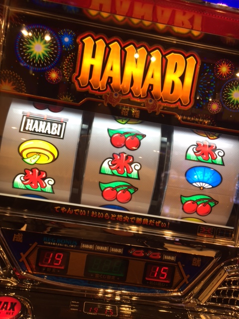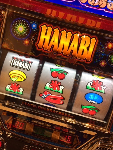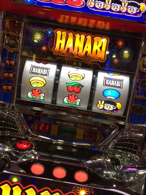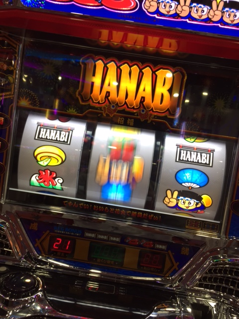 ハナビは左上段にドンボーイを狙うとリーチ目が分かりません。いや、分かりませんというのは嘘ですが、ハサミ打ちで右下段に七停止の2確師匠、上段にドンボーイないし七停止の小役ハズレ型くらいしか知らないので基本的に左上段にはいつも暖簾を狙っています。