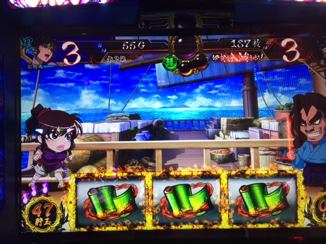 食いつきにやや梃子摺りましたが、一発目のBCがBTに繋がる幸運に恵まれ、スロは設定よりも相性が大事であることを再認識。タイミングよく巻物を引いたり、駿府城に何度か観光に出掛けたりと展開の良さもさることながら、BT突入率、同色出現率ともに良好だったため昼過ぎには早くも5万枚を射程圏内に捉え、空のドル箱を30個ほど用意したわけですが、やはりそう上手く事は運ばないようで通常時のBC間で大きくハマってジエンド。ザ・ウィーラードじゃないけどジエンドです。 ![]()