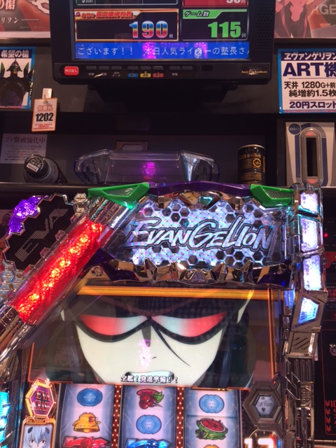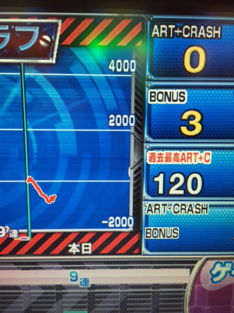 この日も酷かった。朝イチからエヴァンゲを打ったのですが、ボーナスこそちょいちょい引くものの、下にあるスランプグラフをご覧になれば分かるように肝心要のARTがまるで引けない。ボーナス中に音が鳴ったらちゃんと左リールに特定の箇所を狙ったにもかかわらず、まるで当らない。確率極悪、獲得枚数の少ないジャグを打っている感覚です。 ![]()