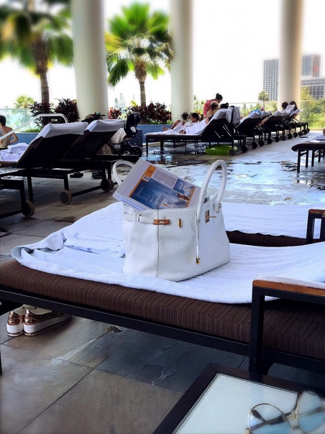 上にある写真をご覧になればお分かりのように、先日、ハワイで宿泊したホテルのプールに監視員はいませんでした。これはつまり物を置いてどこかに行ったら盗まれる可能性があるという注意書きに他ならないのですが、アメリカ人は身体だけでなく器も大きい。隣のベッドで寛いでいたマダムはエルメスの白いバーキンを1時間以上に渡って放置。中に財布や携帯、電マなどが入っているであろうことを考えたら、日本人の感覚としてはちょっと頭がイカれているとしか思えません。