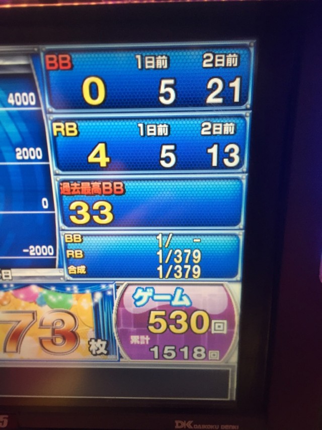 この日は中小役ばかりで大当たりを引くまでに35本。ここ最近のバーサスはいつもこんな感じでもはや大当たりに見放されているというか、終わりの見えぬ大当たり無抽選ゾーンに突入したというか、とにかく酷い有様なのです。それが証拠に今月はバーサスばかり打っているのに一度も勝てていません。全敗です。マジ卍です。
