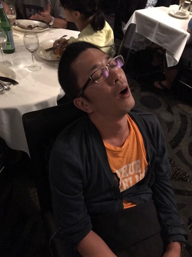 旅行会社で添乗員をやっていた頃の渡航も含めるともう100回くらいは訪れているでしょうか。これだけ行っていると中には天気に恵まれなかったり、風邪を引いて何日か無駄にしたり、友人が行く先々のレストランで寝てしまったり(※下写真参照)、残念なハワイもそれなりにありましたが、不思議なことにもう二度と行きたくないと思ったことはありません。旅行を終えて帰国すると何故かまたすぐ行きたくなるのです。