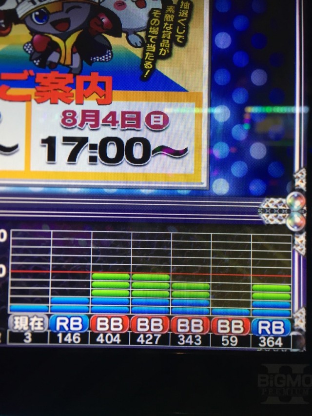 彼女とおまんじゅうの約束でもしていたのでしょうか。2時間ほど打ってドル1箱のコインを獲得すると後ろ髪引かれ隊の生稲晃子みたいな顔して台を離れましたので、それならとエナる気満々で移動したところ、少しハマってチェリー重複バケ。そこからまた少しハマって引いた同色ビッグを消化している最中に事件は起こりました。