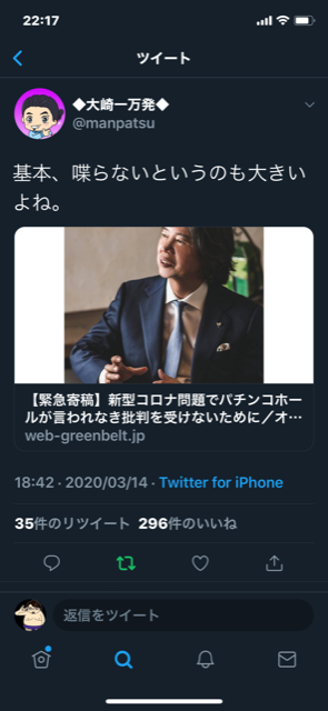 ということは、マスクとキモ手袋を装着して、こまめに手洗いと消毒さえすれば感染のリスクは低くなるのではないか。もしかするとホールは安全地帯であり、スロが打ちたくても打てない悲しみにさよならなのではないかと、朝イチ、かなり密着した状態で抽選のマスに並び、マスクをしていない前後の客と狙い台の話をがっつりしているときに思いました。って、これか。これがいけないのか。