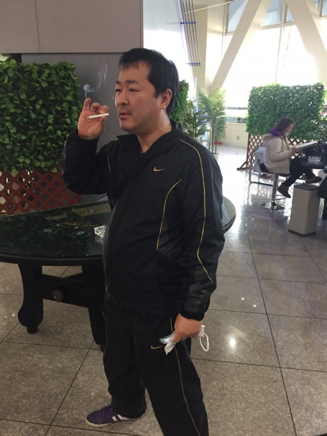 ※開店前に打ち子たちに軍資金を配り終え、一服する軍団の元締め。