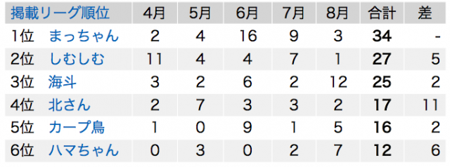 8月末日時点での掲載ペナントリーグの順位表を見ていきましょう。