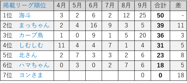 9月末日時点での掲載ペナントレースの順位表を見ていきましょう。
