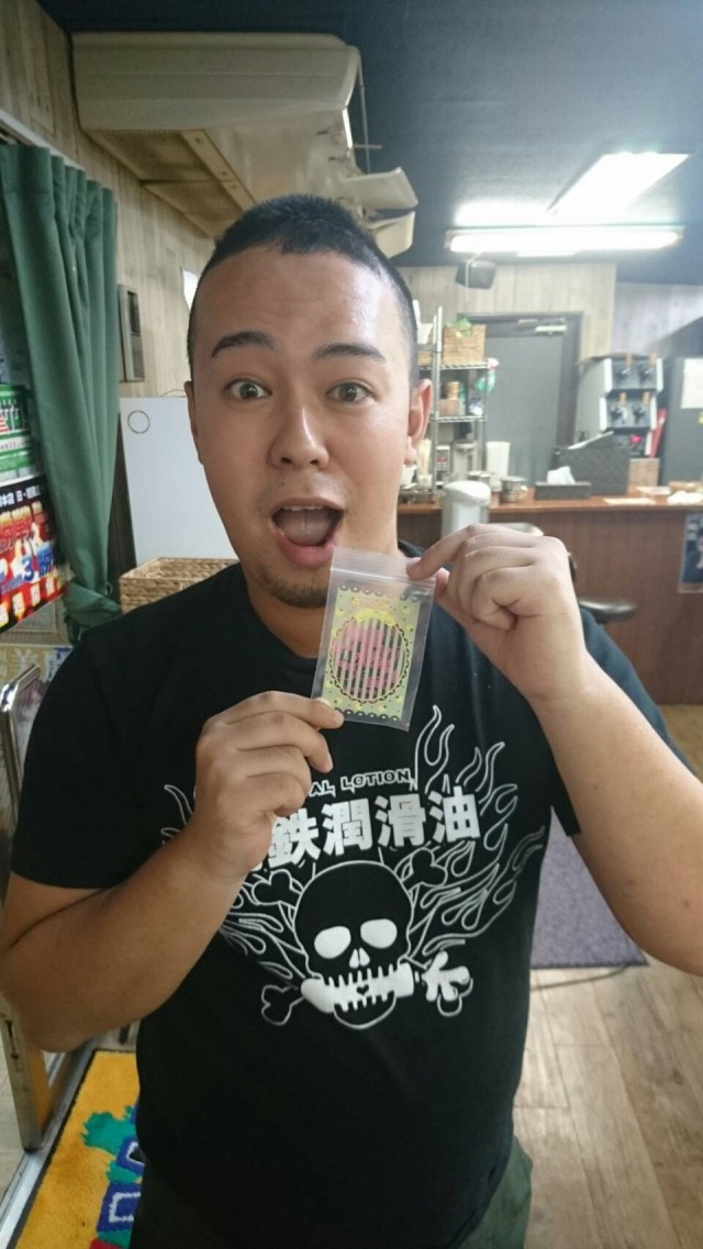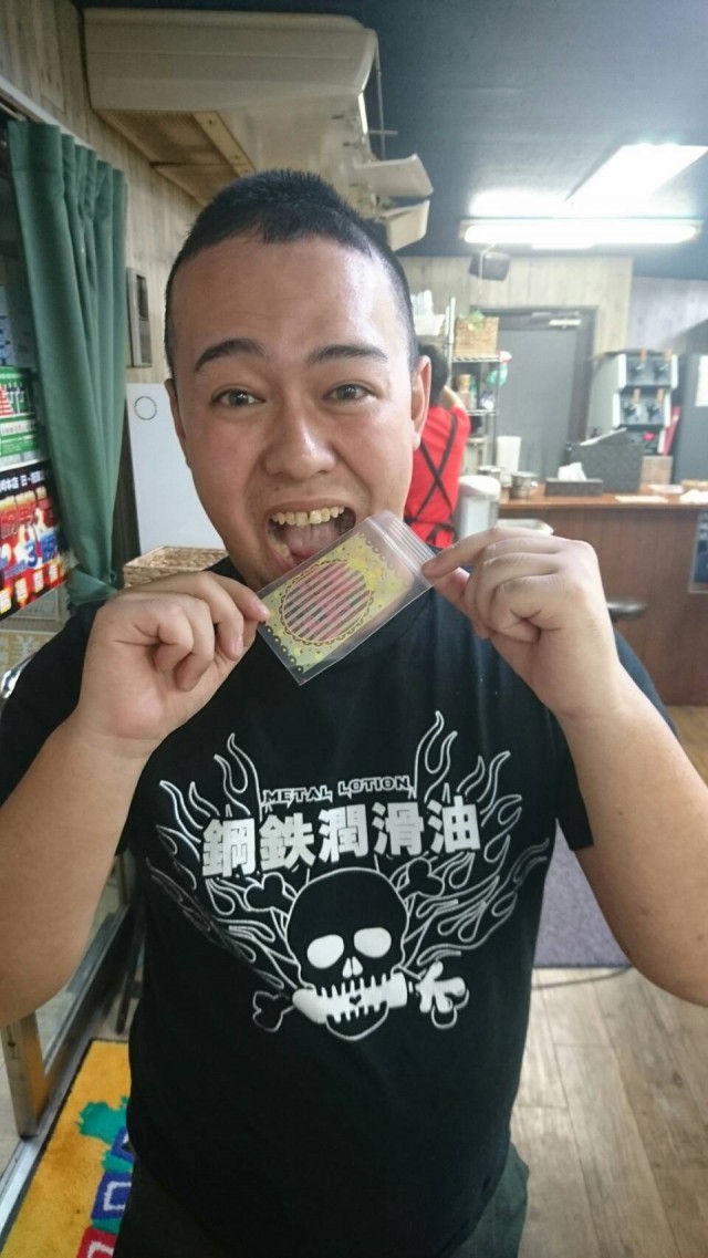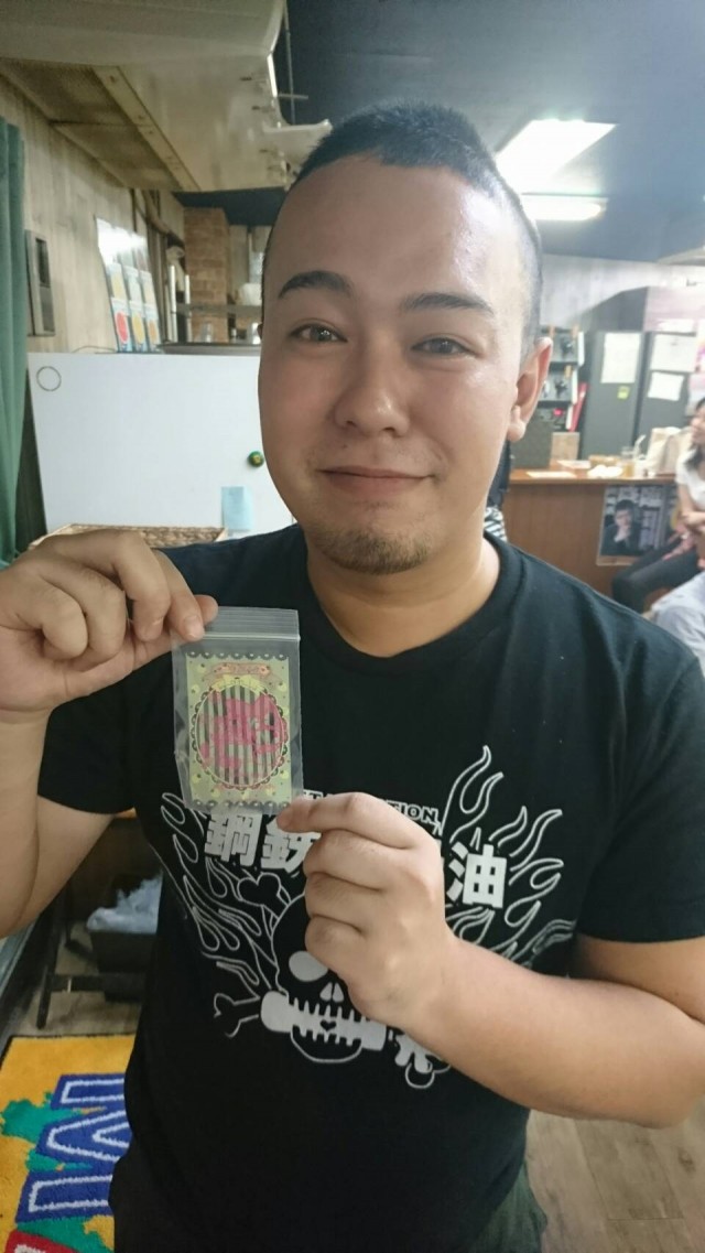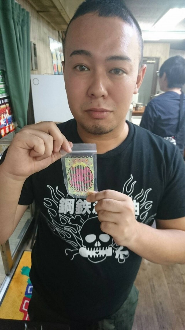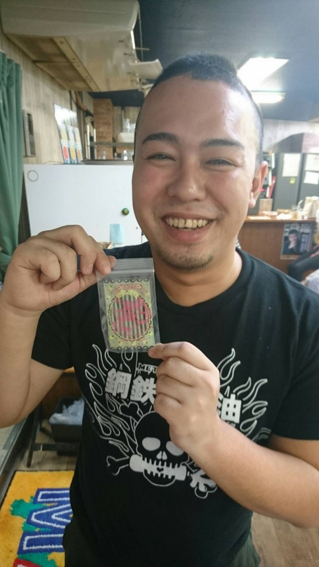 (写真は意外につぶらな瞳のマッスル峠氏とマイメロの髪の毛が入った小袋ことパケ)