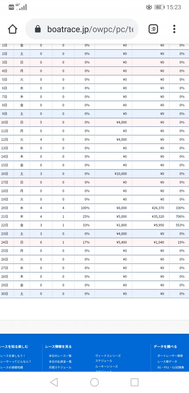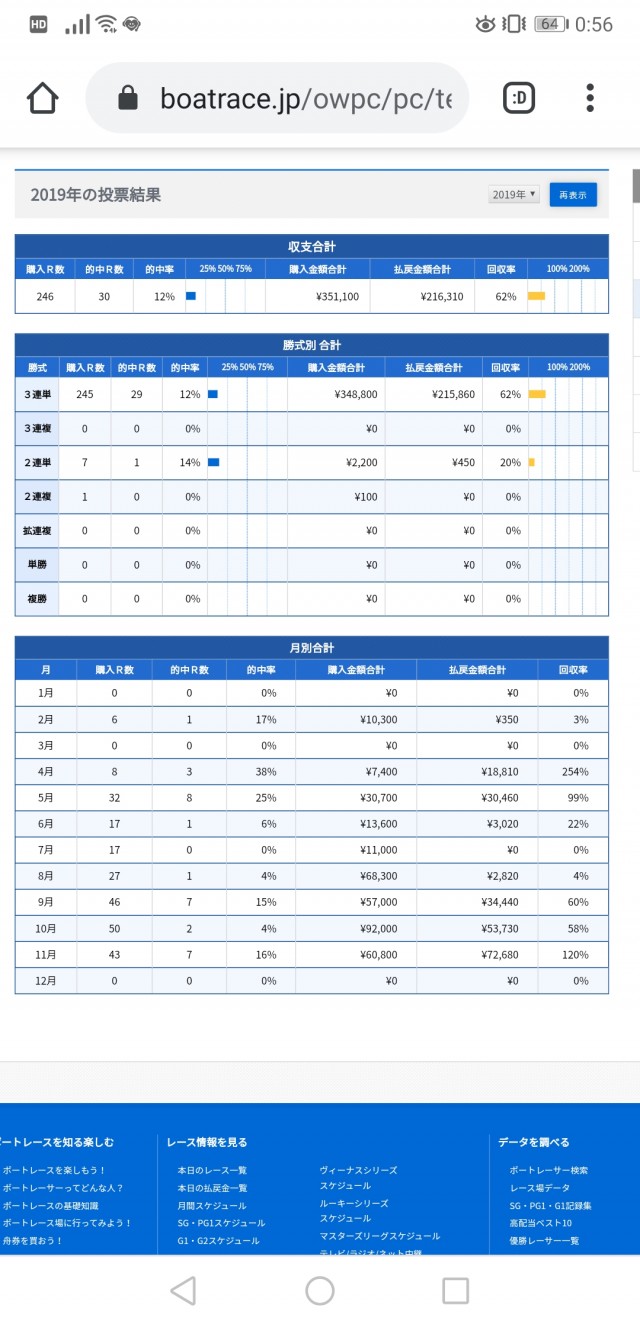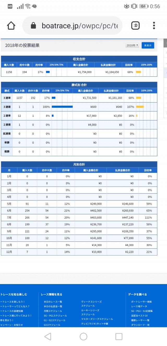 今年はやってやったなと思っていたところ、どうやらPCやケータイ等で舟券を買えるサービス、通称テレボートで過去の回収率が解るとの事。