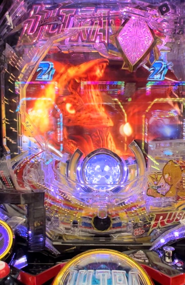 | 17 | 保留変化予告(紫) →GUTSメカステップアップ予告(ステップ2) →7図柄停止予告(×3)→怪獣全画面予告(ゴルザ・赤) → 希望の光チャージ予告(緑) →怪獣SPリーチ(ゴルザ・タイトル赤) →決戦バトルSPSPリーチ (VSゴルザ・カットインパワータイプ)→ハズレ |