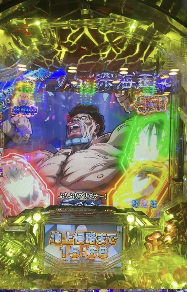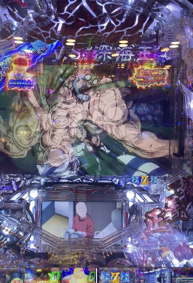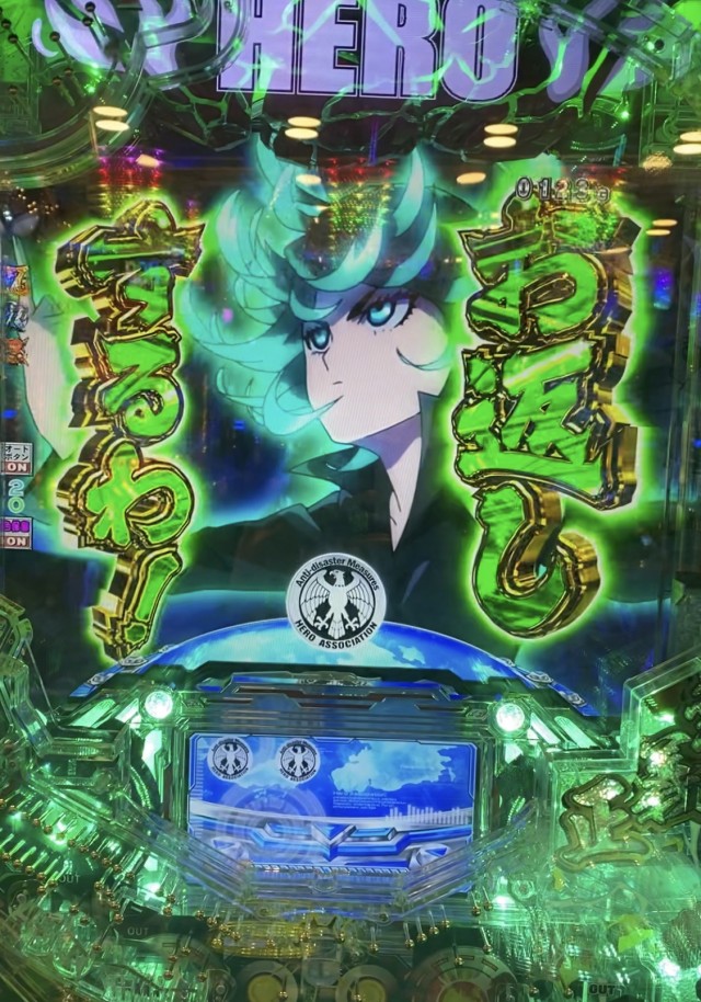 | 3 | ヒーローエフェクト予告(タツマキ)→損壊率予告(緑) →よっこらしょ予告→怪人襲来ゾーン(鬼) →ヒーローアクション予告(シルバーファング) →S級ヒーローゾーン→ 岩石役物落下予告(赤) →損壊率予告(赤) →ヒーローアクション予告(シルバーファング) →中リーチ(VS深海王)→ハズレ |