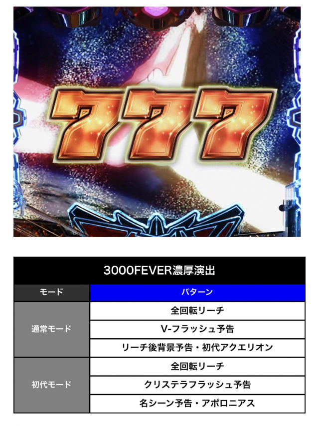 ちなみに、初代モードでの3000FEVER濃厚演出は、「全回転リーチ」「クリステラフラッシュ予告」「名シーン予告・アポロニアス」があるみたいだよ。要チェックや(いきなりのキャラ変更)!!