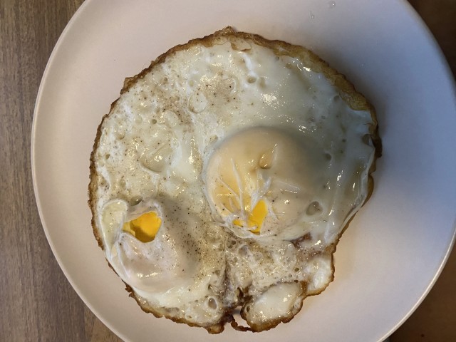 目玉焼きです。卵2個で味付けは塩コショウです。調理時間約5分です。