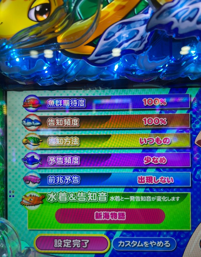 これまでに数えきれないほど魚群をハズして残念な気持ちになっているので、カスタマイズで魚群期待度は100%に! є(・Θ・。)э››~ギョギョ
