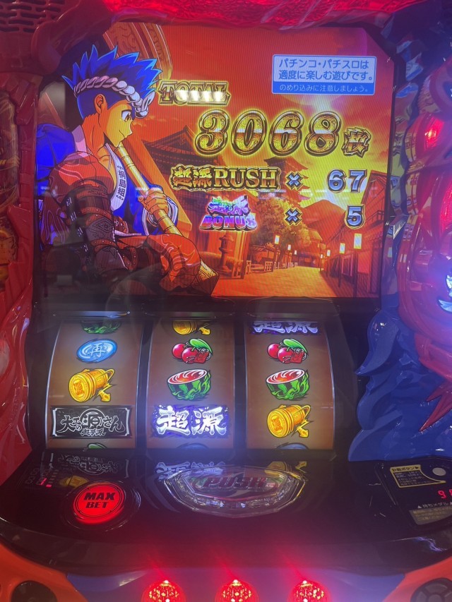 実は今回のチャレンジ、夜にやったのですが、昼間はパチスロの新台『大工の源さん超夢源』で+4000枚の大勝を飾っています。