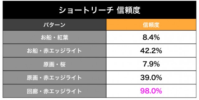 調べたところ、今回発生したのはショートリーチの「お船・紅葉」パターン。信頼度8.4%…。惜しくもなんともなかったです(笑)。