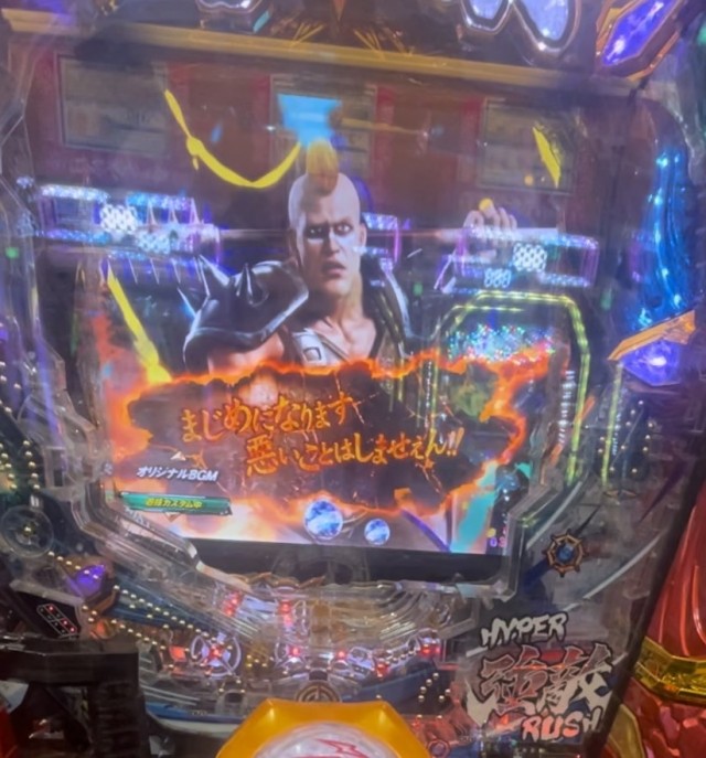 | 11 | 保留変化予告(点滅)→有情あおり予告 →神拳BATTLE有情→2揃い →大当り(強敵RUSHチャレンジ失敗→4R通常) |