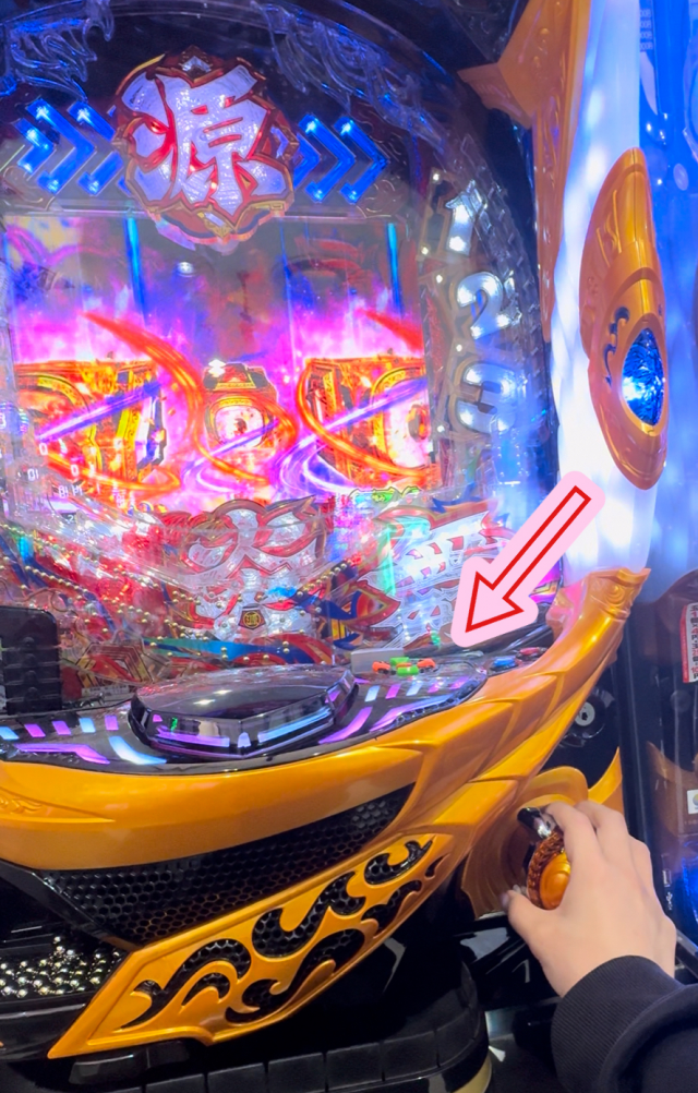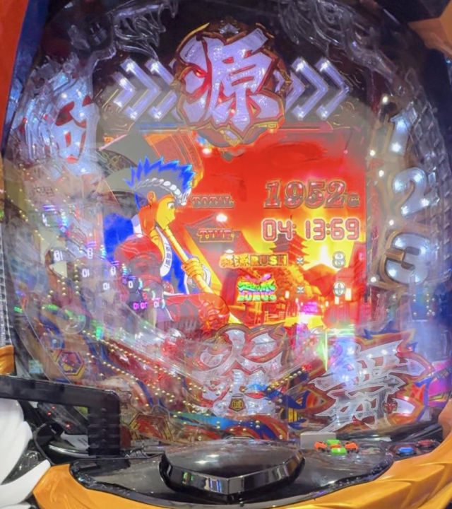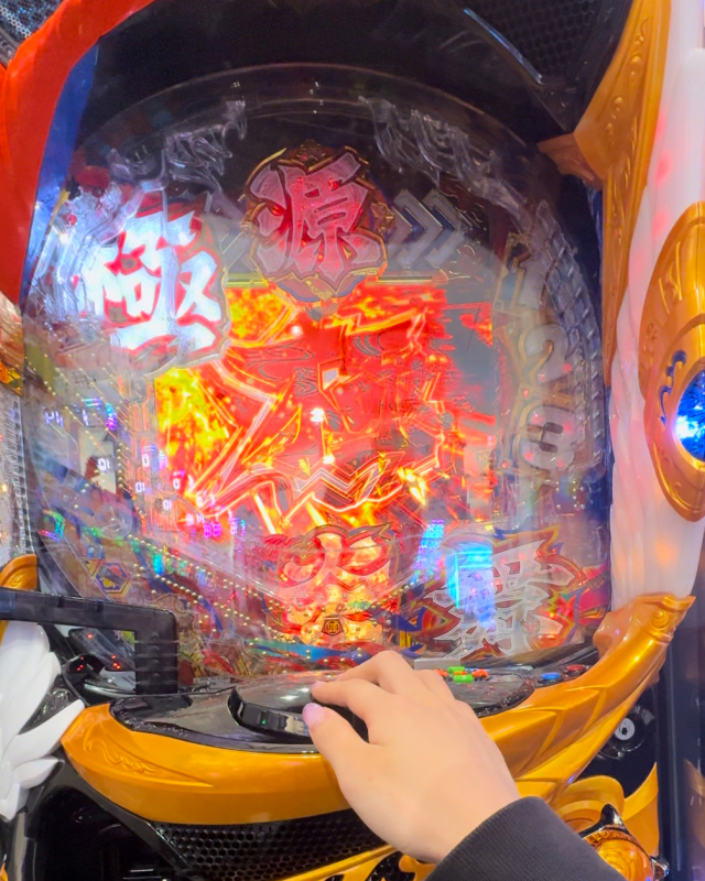 | 3 | シャッター先読み予告(左回転・青炎) →ステルスフラッシュ→連続予告(123ランプ・赤) →風水予告(極ギミック作動)→極限炎舞 →バトルリーチ(後半・凪)→2揃い→大当り (超源チャレンジ・バトル告知→成功→3R+超源RUSH) →超源RUSH(8連・1952個) |