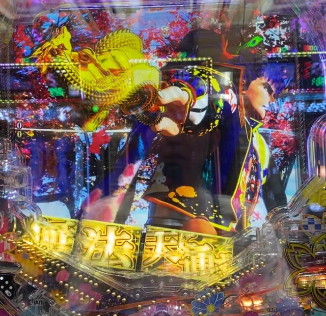 | 5 | 先バレ→保留変化予告(野菊) →グレードアップ予告(大喝→怒髪天) →佐渡ウインドウSU予告(SU5・赤→赤→赤→赤→赤) →ショートリーチ→キセル予告→花鳥風月リーチ →廻天激トリプルリーチ→5揃い →大当り (2R・CHALLENGE BONUS・城門突破・ 城門ゲージ中速・復活あおりボタン2個→失敗) |